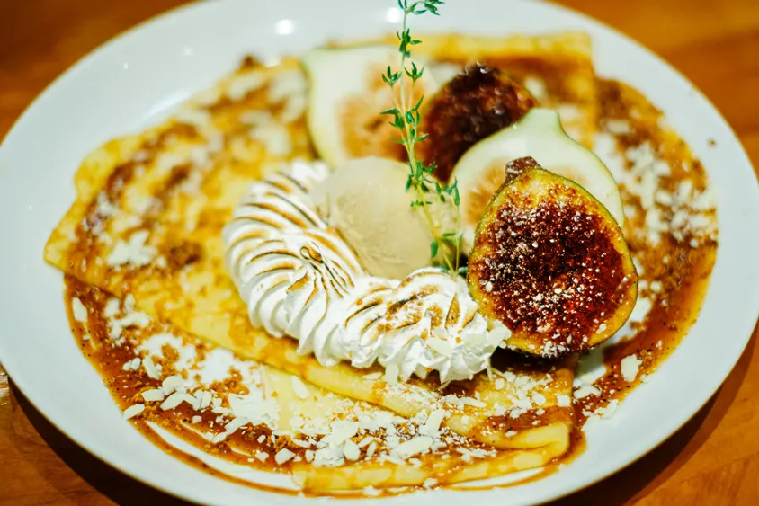 毎年楽しみにしてくださるお客さんが多い人気メニュー。五感で完熟イチジクの贅沢な味わいを楽しんでもらいたいと、小さく切らず大ぶりのままクレープに添えました。甘口のシードルとぜひ合わせてみてください。