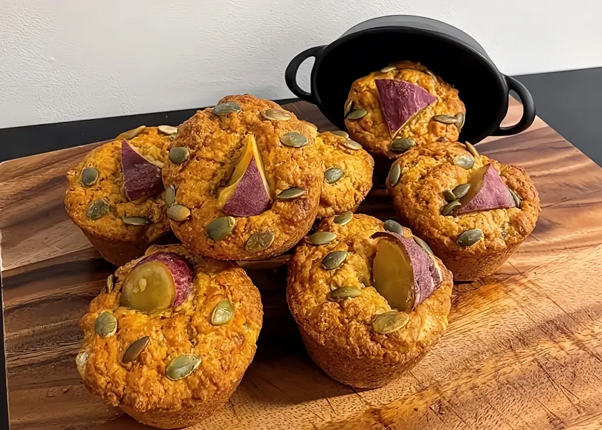 角切りのサツマイモやカボチャのピューレが練り込まれた生地に、栄養満点のパンプキンシードと、徳島県特産鳴門金時の甘露煮を乗せて焼き上げた、愛され定番メニュー。カボチャの優しい甘みと鳴門金時の力強い甘味をシナモンの香りが包み込む、秋だけ出会える豊かな味わい。人気のため夕方にはなくなることも。