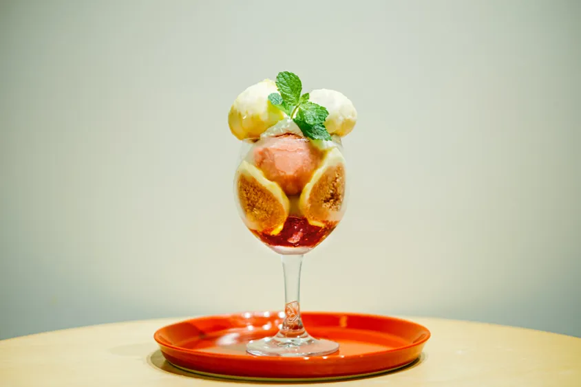 まるまるとしたフレッシュないちじくがトップに君臨し、グラスの中にはなんと1個分のいちじくがスライス。合わせてフランボワーズのゼリーやアイス、バニラアイスに、エスプーマミルクが合わさる幻想的なパフェ。旬の時期だからこそ贅沢に楽しめるパフェは続々と虜を増やし、毎年多くのお客様が待ち焦がれる定番メニュー。