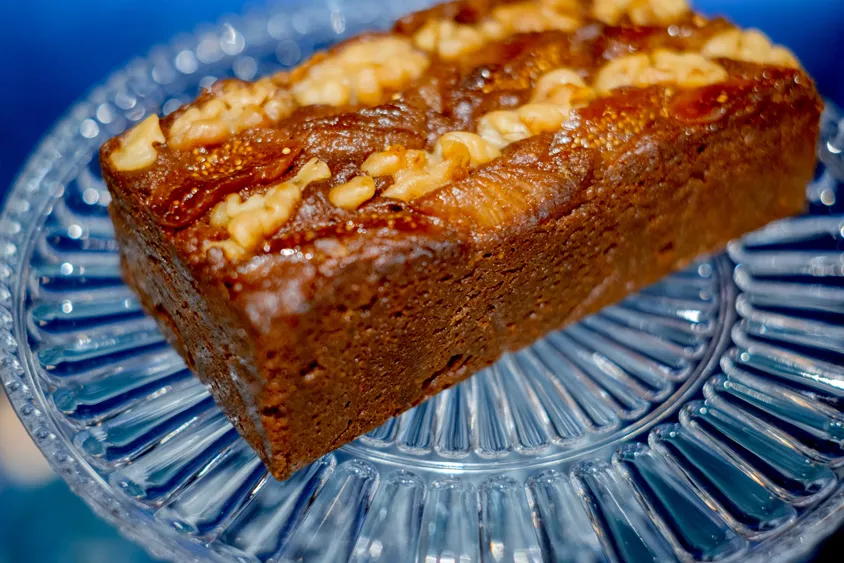 濃厚なガナッシュを用いたしっとりとした生地のパウンドケーキを一口食べると、散りばめられた胡桃とドライイチジクが顔を出す。赤ワインとブランデーに漬け込むことで生まれた華やかな風味と、イチジクの繊細な甘さが◎。秋の夜長にワインと共に、楽しみたい。