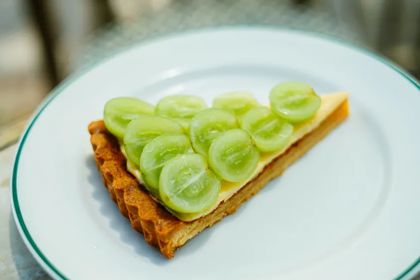 AUX BACCHANALESでは、店舗ごとにスイーツを考案しています。梅田店は洗練されたフレッシュなフルーツを使ったメニューが多く、シャインマスカットのタルトもここ限定。この機会にぜひ堪能してください。