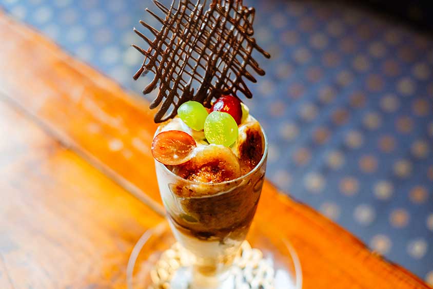 キャラメリゼにして甘さを引き立てたイチジクとふくよかなブドウの粒に、紅茶のアイスを添えた一品。「秋の味覚をふんだんに」という想いを込めて、中段にはフレッシュなイチジクとマロンペーストを仕込んだ。飾り付けとして添えたビターなチョコがほろ苦いアクセントとなり、味わいを引き立ててくれる。