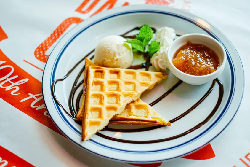 キャラメリゼはしっかりと苦味を出し、口にした時に感じるいちじく自体の甘さとコントラストを楽しんでほしいと考えました。オーダーを受けてから焼くワッフルは、ぜひ出来立てフワフワのうちに。