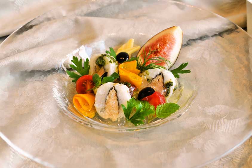 契約農家が育てた大ぶりの完熟イチジクの甘みを引き立て、旬の味覚とともに仕上げた贅沢な逸品。トマトの香りを閉じ込めた透明なゼリー、爽やかなバジル、彩り豊かなハーブが織りなす。猪名川流域の水や水はけの良い豊かな土壌が生み出した果実と、シェフの視点が組み合わさったひと皿に、誰もが心打たれるだろう。