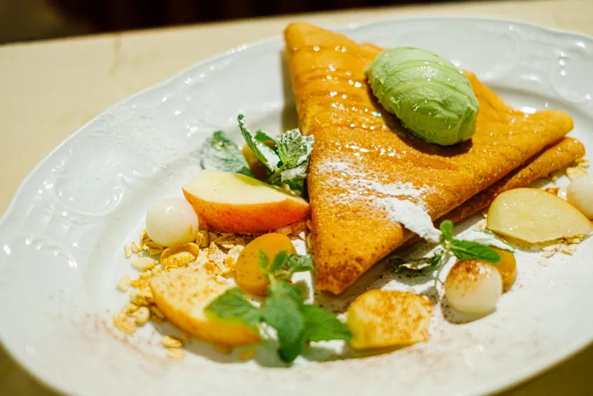 秋の食材による大人な雰囲気を味わってほしいと、煮詰めてしっかりと甘みを出した栗と、リンゴのコンポートを主役にしたクレープを。上に添えられた抹茶アイスや、周りに散りばめられた白玉、グラノーラ、ホイップクリームが生む、食感の変化も楽しい。ワイン専門店による、スイーツ好きを唸らせる一品。