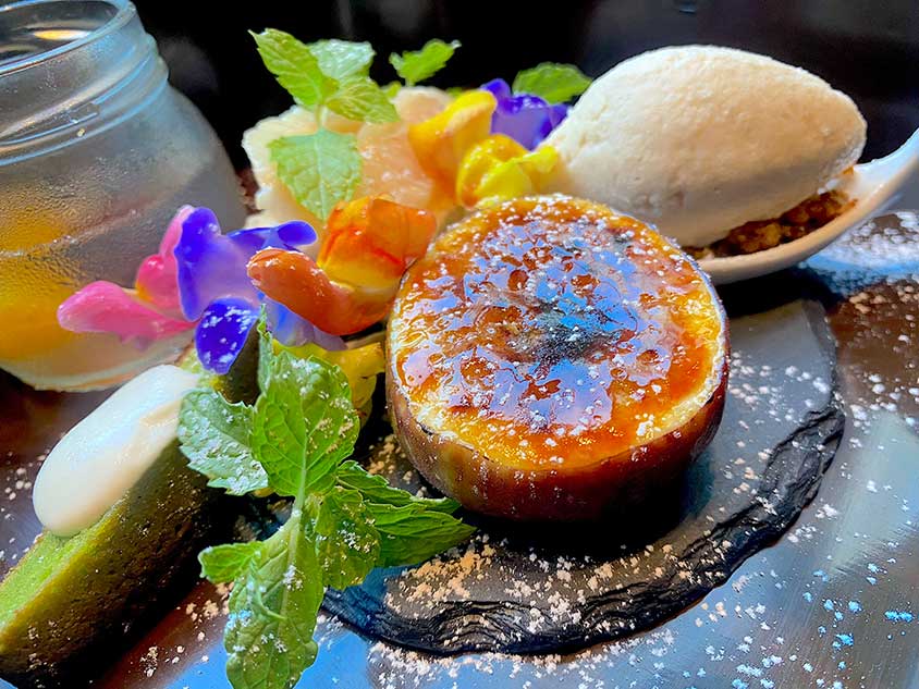 ブリュレのなめらかさや、口にした時に感じる焦がした風味をしっかり届けられるように丁寧に仕上げました。さらに、カルヴァドスで芳醇な香りを楽しんで。上にのせたバニラアイスがさっぱりした味わいを加え、ブリュレの甘さを引き立ててくれます。