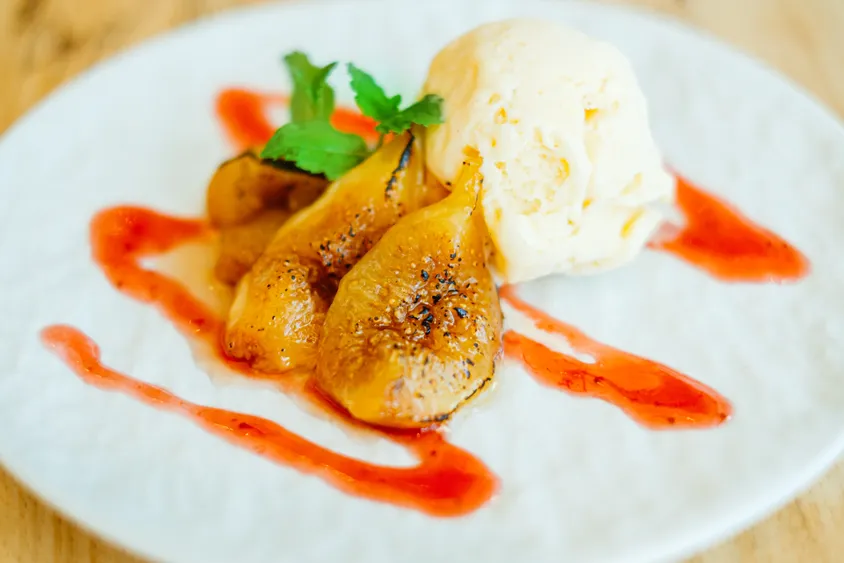 フランス・プロヴァンス地方のラルナージュ産の白土煉瓦で造られた石窯を使用するMEATLAB.8129。熟したいちじくを白ワインときび砂糖でコンポートし、石窯で焼き上げることで水分を逃さず凝縮した甘みを引き出す。やさしい酸味のラズベリーソースや冷たいバニラアイスと共に、味わいのコントラストを楽しんで。
