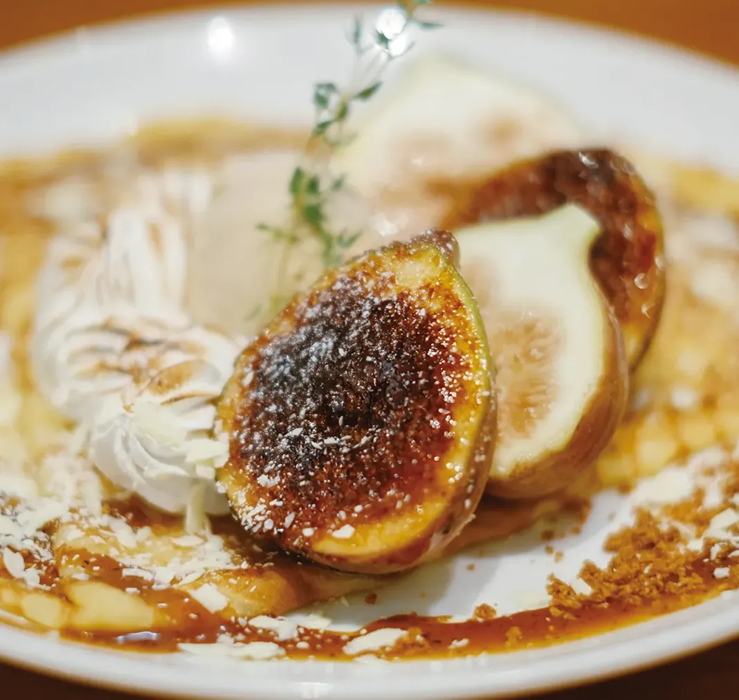 契約農家から届く、ちょうど完熟に達したものを見極めて選ばれたいちじくたち。甘みと瑞々しさを持った果実をキャラメリゼし、ほうじ茶やバニラのアイスを添えた焼きたてワッフルはご褒美のようなひと皿。ローストしたナッツやメープルシロップで、高まる秋らしさに魅了。すっきりとした後味のアールグレイと合わせてみて。