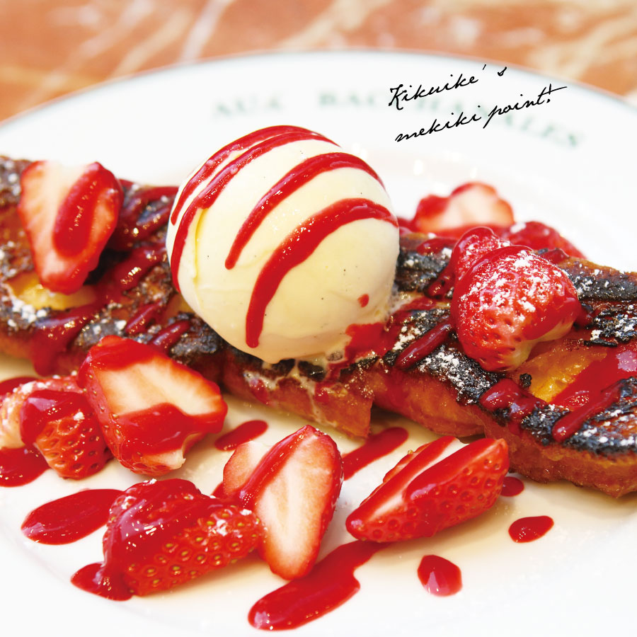 バゲットを使ったフレンチトースト。表面はカリッとアメ状で、中はしっとり。博多の農家から直送される苺の“しあわせもん”を散りばめた春らしい一皿。(※苺は仕入れ状況により変動)