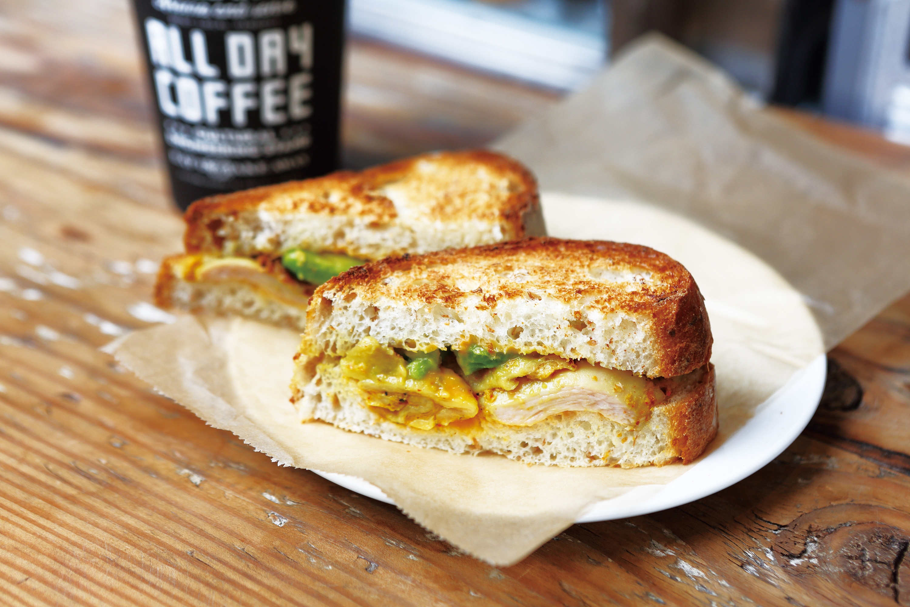 チェダーチーズのソースが、チキン、パン、アボカドをひとつにまとめてくれている。石釜で焼いたライ麦パンは、香ばしく風味豊か。
